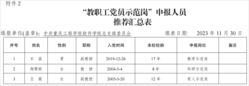 根据校党委《关于评选2023年“教职工党员示范岗”的通知》(渝工程委〔2023〕号)的要求,经过教职工党员推荐、相关负责人讨论、党总支委员审议等工作流程,拟定石磊同志为“教学示范岗”推荐人选、陶雪娇同志为“科研示范岗”推荐人选、王薇同志为“育人示范岗”推荐人选。