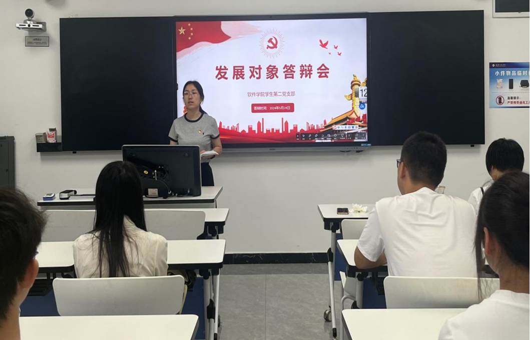 (图/文 软件学院 唐其琪)为加强基层党组织建设,考察发展对象的综合素养,严格把关党员发展质量。5月24日,软件学院学生第二党支部在7610教室开展了发展对象答辩会。会议由软件学院学生第二党支部书记余巧、组织委员任灿,学生党员、发展对象及入党积极分子共10余人参加。