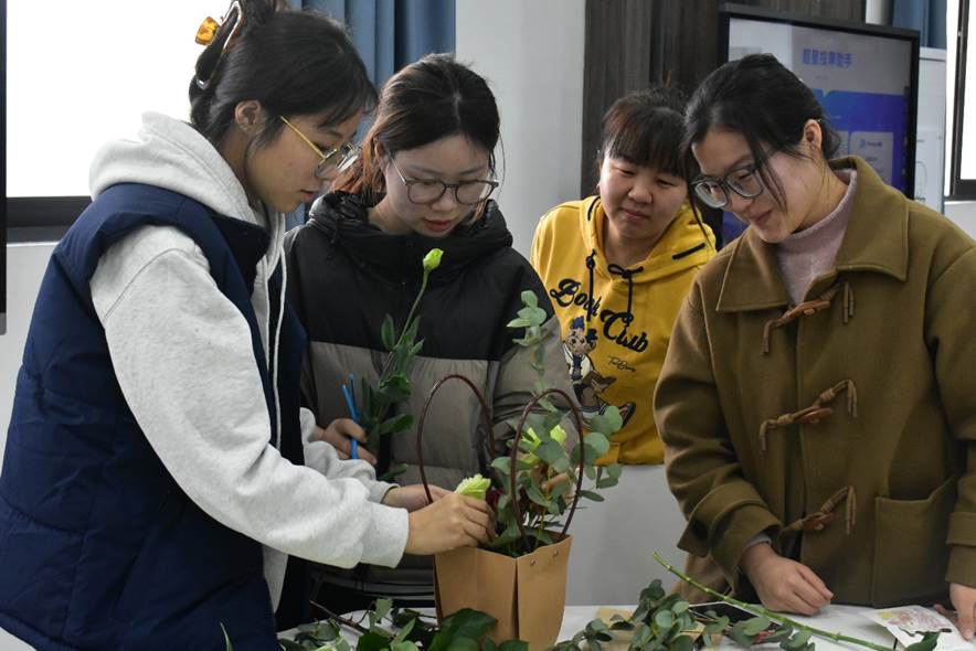 活动以四个学坊为单位开展,将插花艺术与科学、文学、艺术等学科相结合。主持人带领成员从植物学的角度了解花卉的生长习性,从文学的角度欣赏描写花卉的诗词歌赋,从艺术的角度学习色彩搭配和构图技艺等。随后,各小组成员齐心协力,充分发挥创造力,共同完成插花作品。在活动过程中,成员们不仅增进了彼此的友谊与信任,还享受了插花带来的乐趣,感受了自然之美。活动结束时,各小组将精心制作的作品送给老师们,为活动画上了圆满的句号。