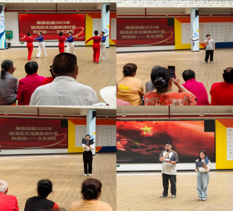 活动伊始,红雁实践团成员化身“文化讲解员”,通过生动有趣的讲述,为村民们详细介绍端午节的起源、习俗,让大家深入了解这一传统节日背后的文化内涵。随后,文艺演出在欢快的水兵舞中拉开帷幕,志愿者与村民们同台献艺,活力四射的舞步瞬间点燃现场气氛。红歌串烧激昂嘹亮,熟悉的旋律唤起人们心中的红色记忆;声情并茂的朗诵,传递着对传统文化的敬仰与热爱;优雅的伦巴舞蹈,更是将现场氛围推向浪漫高潮,赢得台下阵阵掌声。