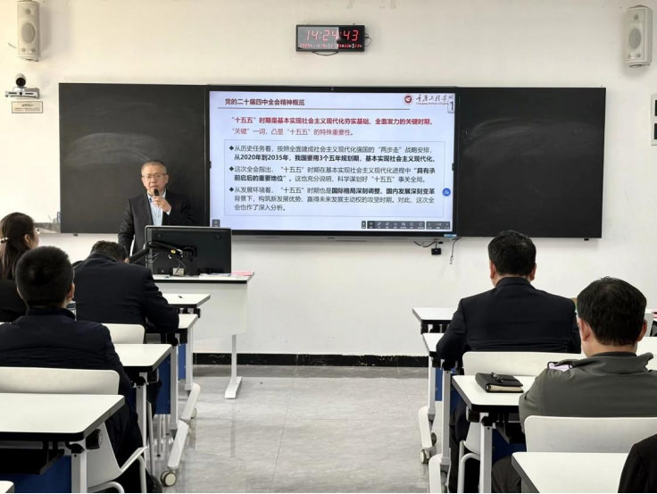 周龙福院长以“党的二十届四中全会擘画发展蓝图—未来五年怎么干”为主题,系统解读党的二十届四中全会公报内容分析了十五五”时期的战略定位,强调这是构筑发展新优势、赢得主动权的关键攻坚期。并详细解读了全会提出的“六个坚持”重大原则和主要目标、具体要求,围绕科技自立自强、现代化产业体系建设等任务,结合学院发展实际引导教职工思考如何将全会精神融入专业建设、人才培养与科研创新。他强调学习贯彻全会精神是当前重要政治任务,老师们要统一思想行动,立足岗位推动学院高质量发展,为基本实现社会主义现代化贡献教育力量。